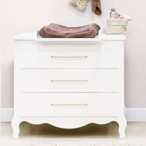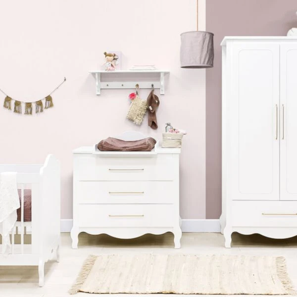 De Bopita Elena Babykamer Wit is gemaakt van hoogwaardig MDF materiaal en is voorzien van een stijlvol design. Het Elena ledikant is afgewerkt met een witte lak op waterbasis en is voorzien van ronde spijlen. Daarnaast kenmerkt het Elena ledikant zich door haar sierlijke poten. Verder beschikt de commode over 3 lades met voldoende opbergruimte. De lades zijn voorzien van ranke, matte en goudkleurige handgrepen. De kamer is geschikt voor zowel jongens als meisjes.
