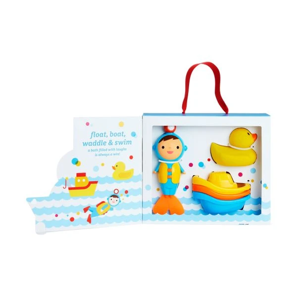 Met de Munchkin Baby’s First Bath Giftset kan je kindje zich heerlijk vermaken in bad! De set bestaat uit een White Hot® Bath Safety badeendje, Scubaâ„¢ Swimming badspeeltje en 3 gekleurde bootjes waar je kindje een trein van kan maken. Omdat de speeltjes zijn voorzien van vrolijke kleurtjes zal je kindje worden uitgedaagd om er mee te spelen. De speeltjes worden in een doos geleverd die het extra leuk maakt om het als cadeau te geven. Verder is de giftset gemaakt van hoogwaardig materiaal en veilig voor je kindje om mee te spelen.