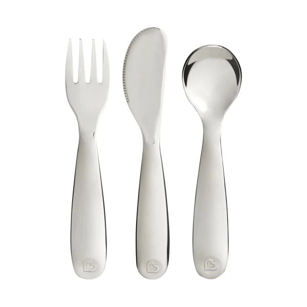 Met het Munchkin Polish RVS Bestekset kan je kindje zelfstandig leren eten. De set bestaat uit een uit een vork, lepel en mes en is makkelijk vast te houden met kleine handjes. Het bestek is gemaakt van hoogwaardig en duurzaam materiaal, zodat het veel gebruikt kan worden. Na gebruik kan de set worden gewassen in de vaatwasser.